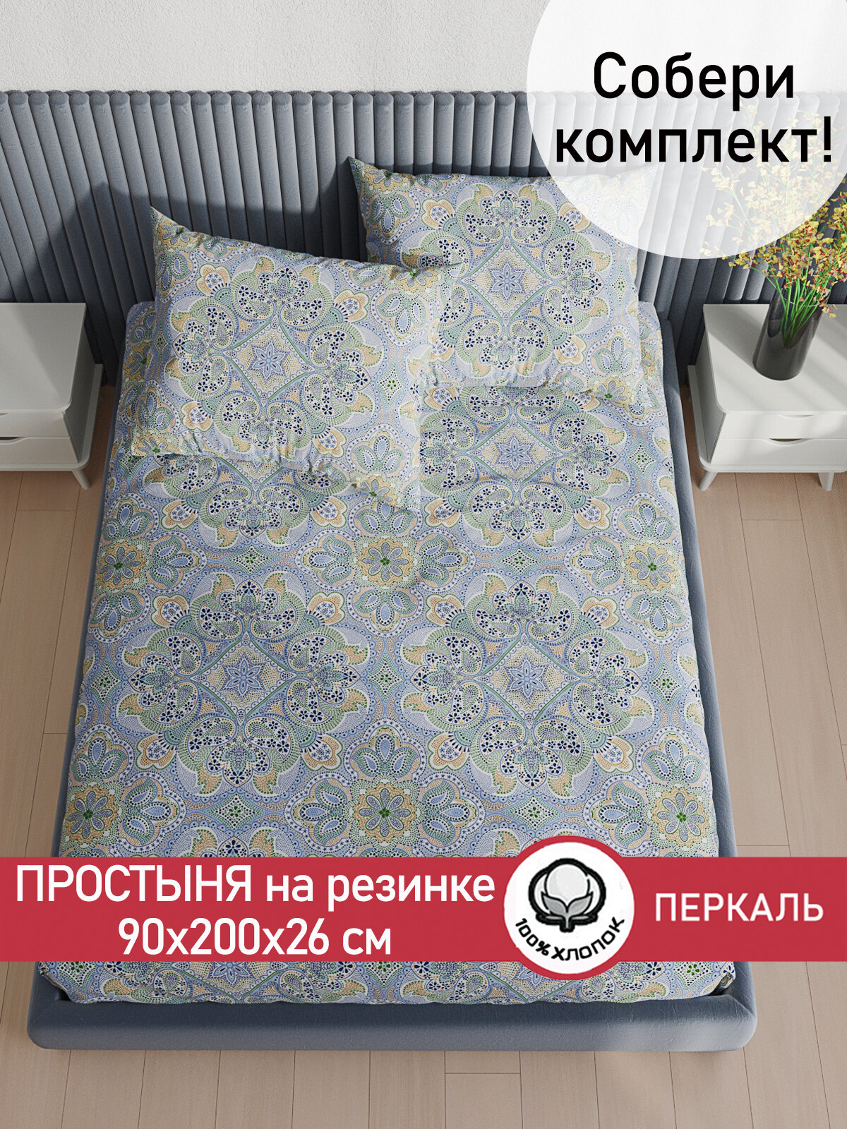 Простынь на резинке Сказка "Бисер" 90х200 см, ткань перкаль, 100% хлопок, высота 26 см информация: