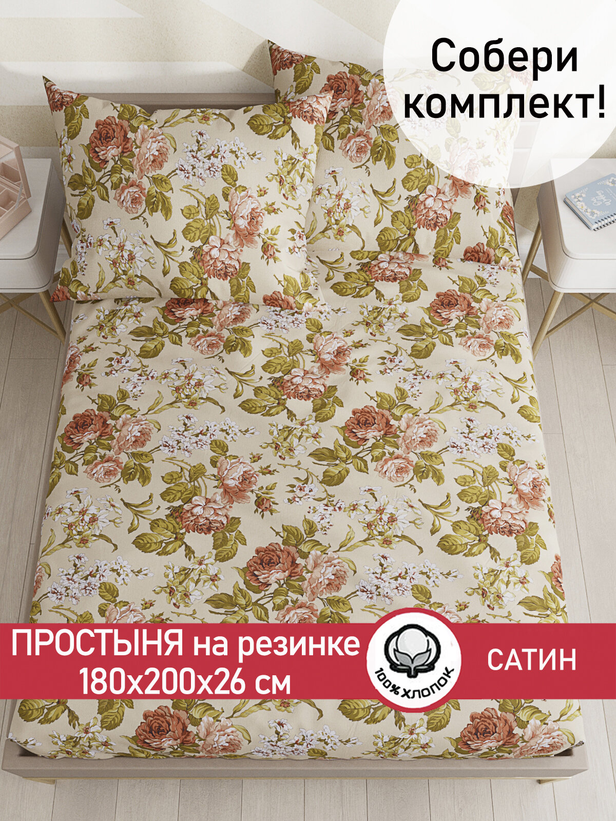 Простынь на резинке Сказка Сатин "Винтаж" 180х200 см, ткань сатин, 100% хлопок, высота 26 см информация: