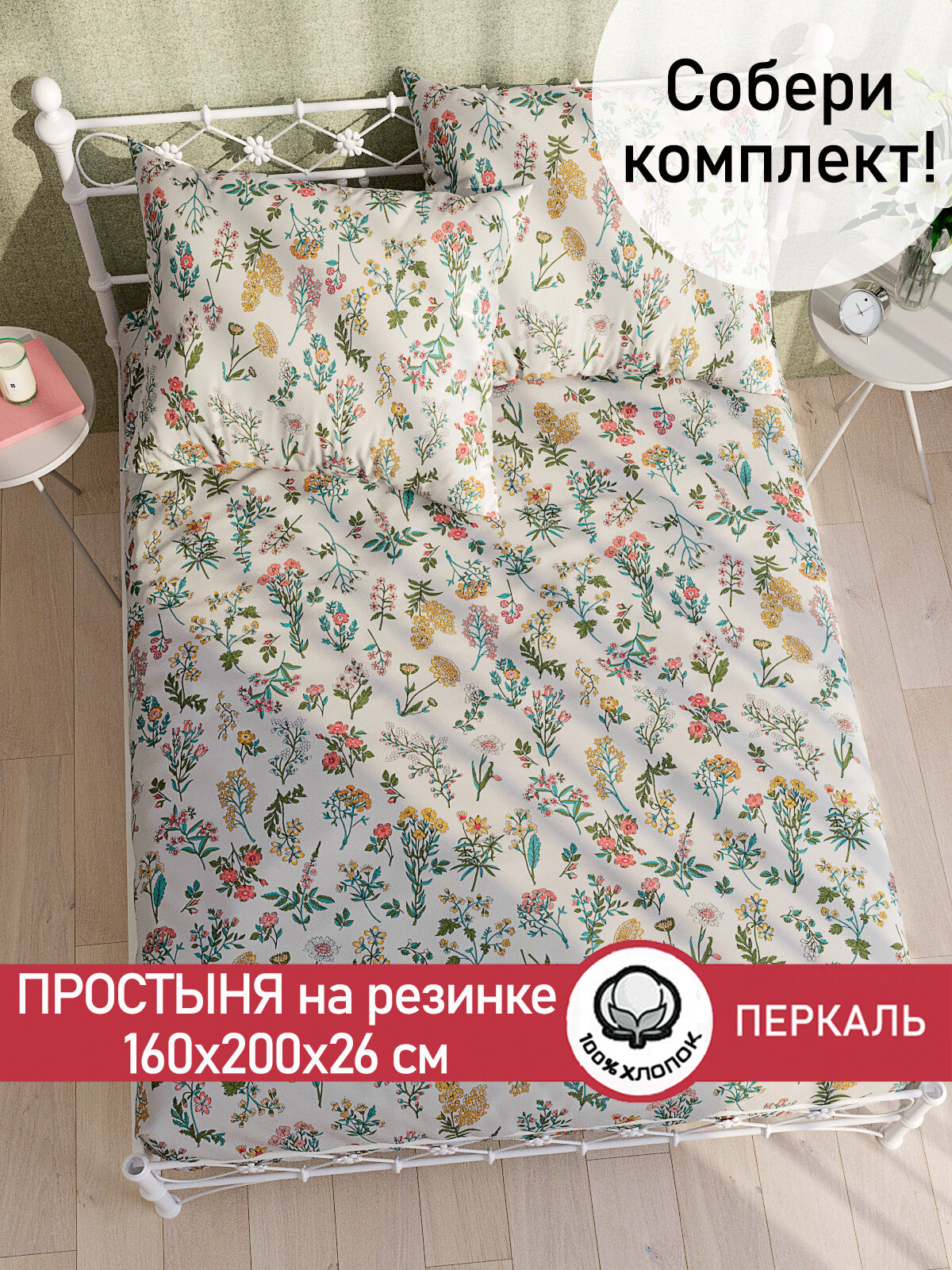 Простынь на резинке Сказка "Ботаника" 160х200 см, ткань перкаль, 100% хлопок, высота 26 см информация: