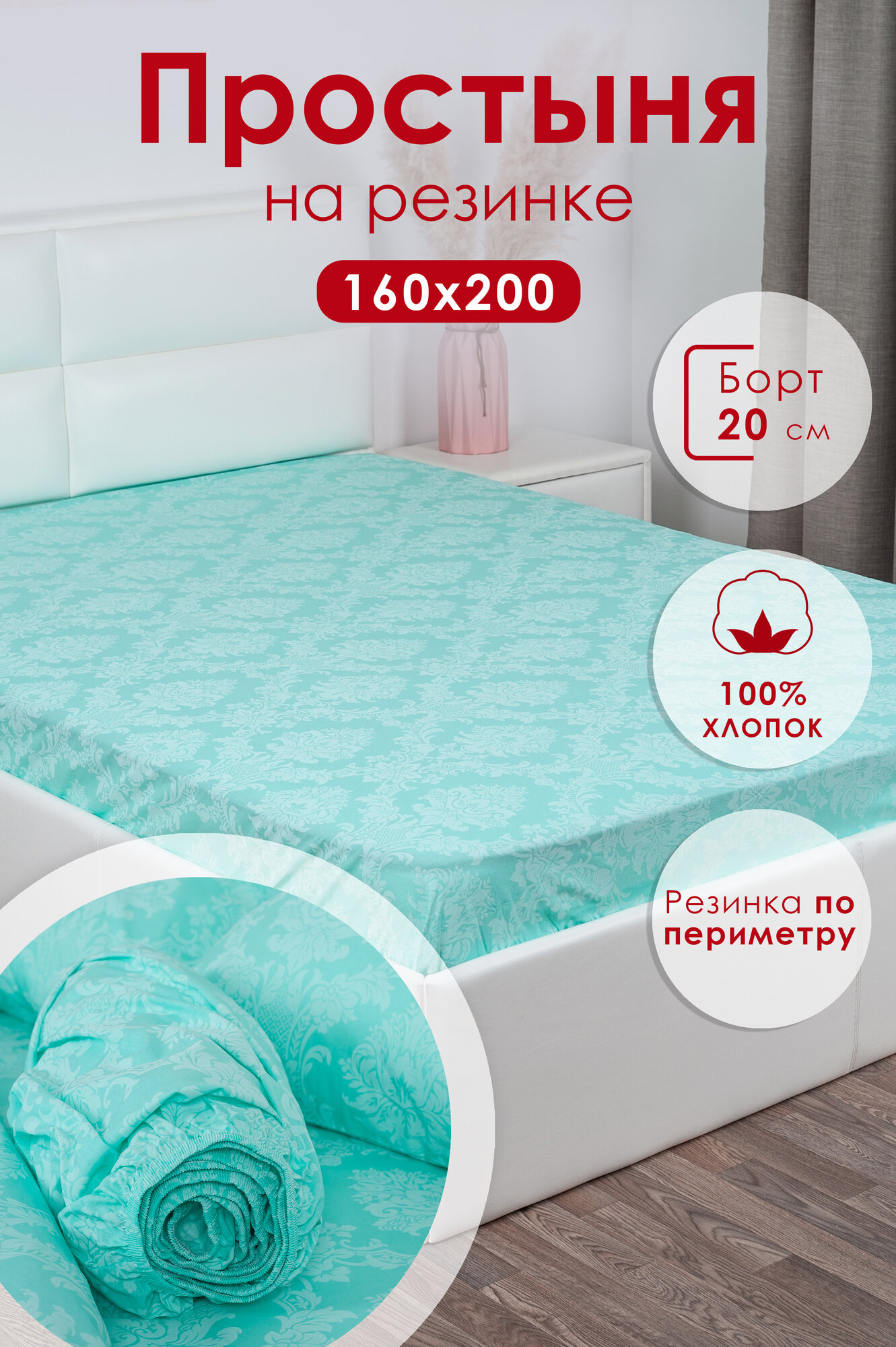 Простынь на резинке 160х200 см Миланика Бирюза поплин, 100% хлопок информация: