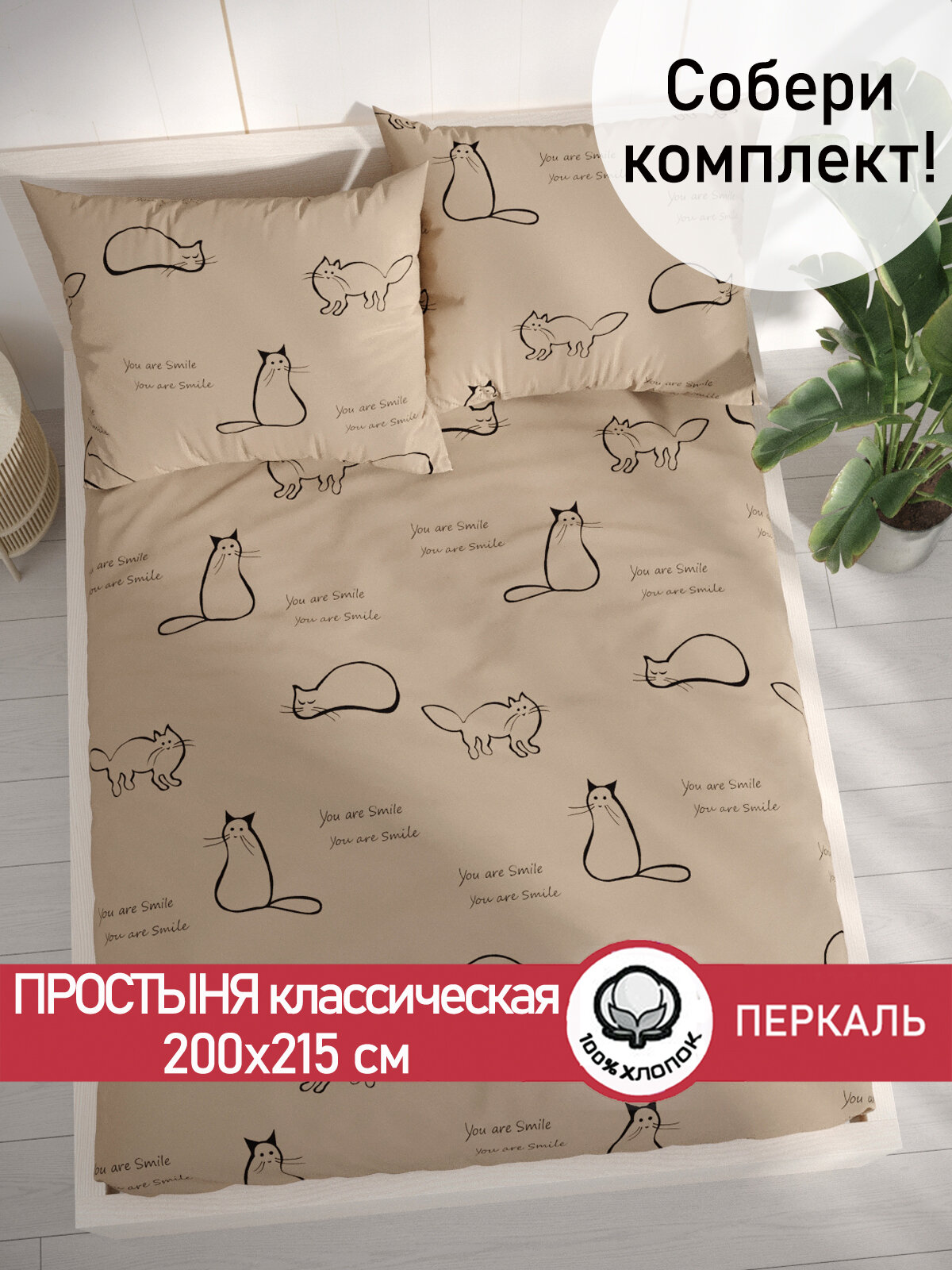 Отзывы на Простынь классическая Сказка "Котики (беж)" 200х215 см, ткань перкаль, 100% хлопок