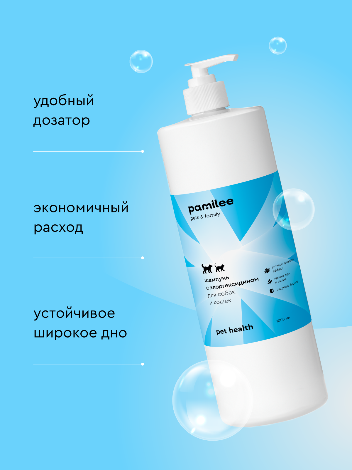 Шампунь для собак и кошек с хлоргексидином 2%, 1л, против зуда, гипоаллергенный, профессиональный, Pamilee информация: