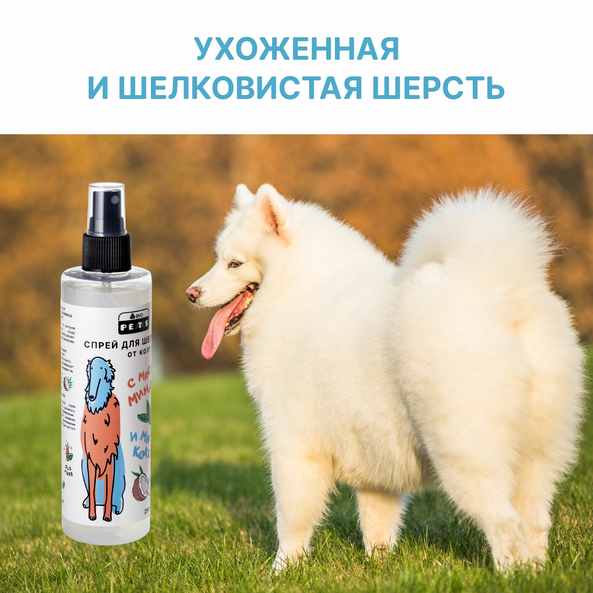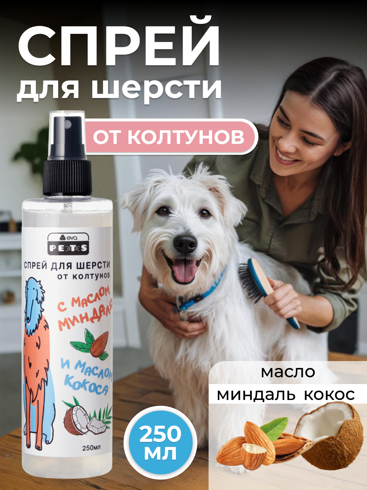 Спрей для шерсти собак и кошек от колтунов с маслом кокоса и маслом миндаля, 250мл информация: