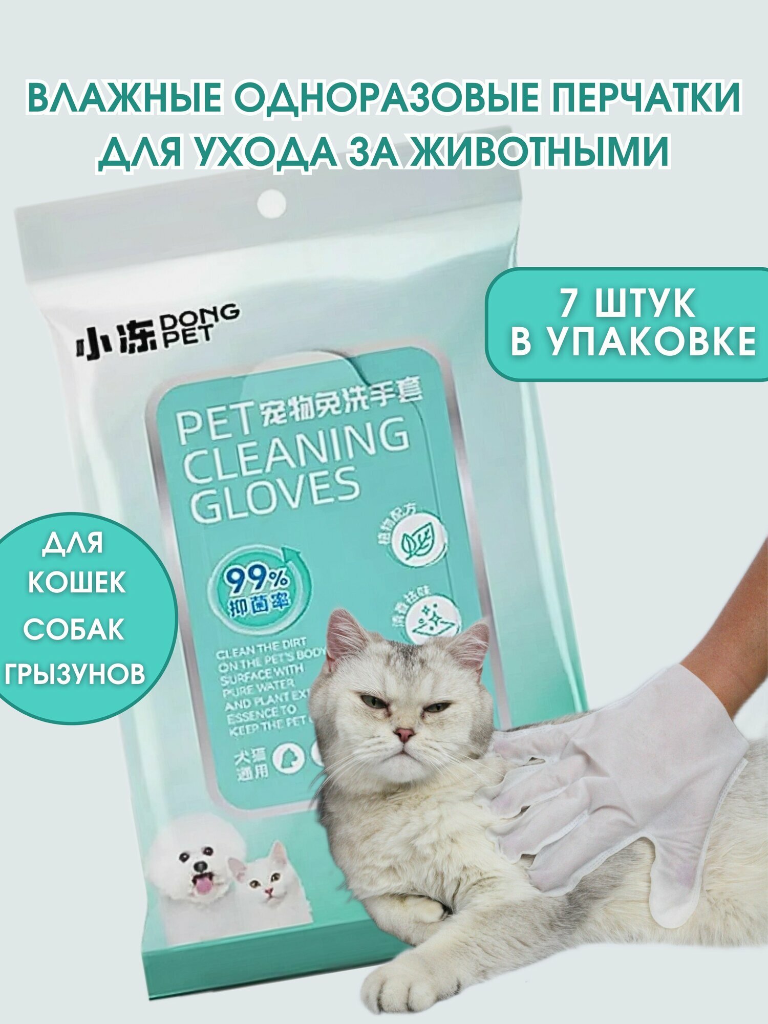 Влажные одноразовые перчатки - салфетки для мытья и ухода за животными Dong Pet, 7 шт. информация: