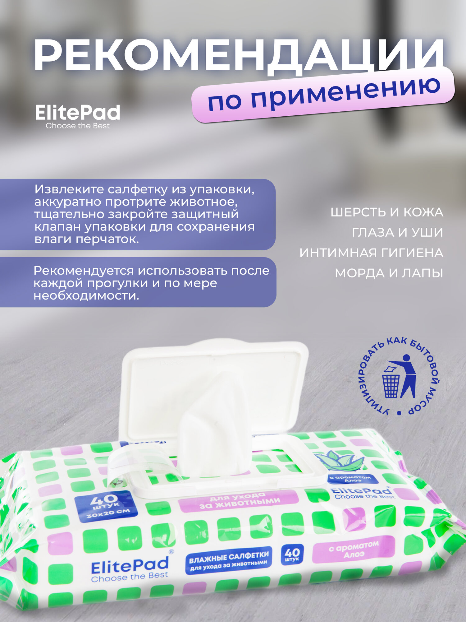 Отзывы на ELITEPAD Влажные салфетки очищающие тканевые для собак и кошек с ароматом алоэ, 30х20см, 1уп/40шт т