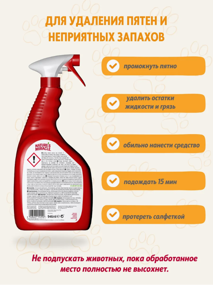Уничтожитель пятен и запахов Nature's Miracle Advanced Stain & Odor для собак c максимальным эффектом, спрей 946 мл информация: