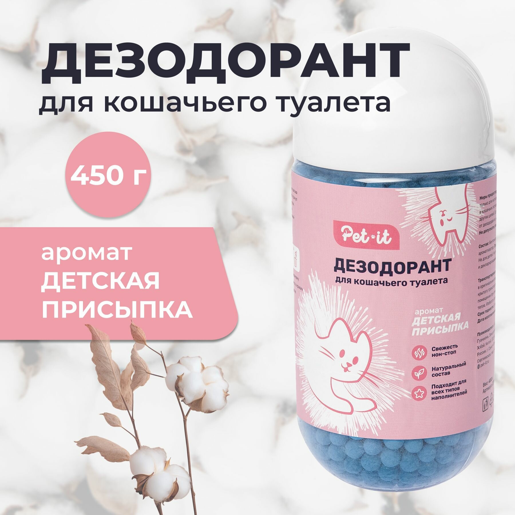Дезодорант-поглотитель запаха Pet-it, для кошачьих туалетов, аромат детской присыпки, 450г информация: