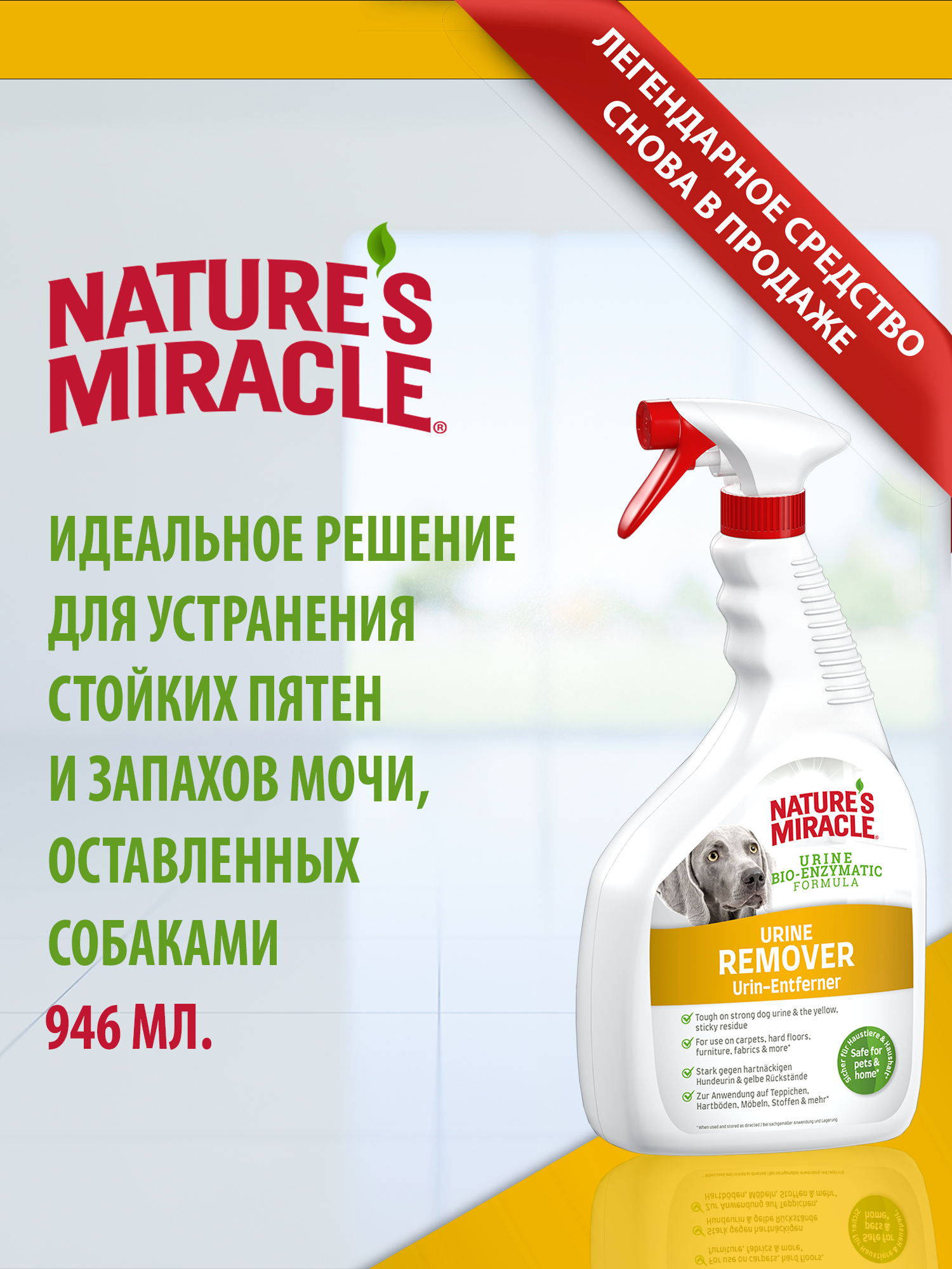 Nature's Miracle Универсальный уничтожитель пятен и запахов от мочи собак Dog Urine Remover 946 мл ( спрей ) информация: