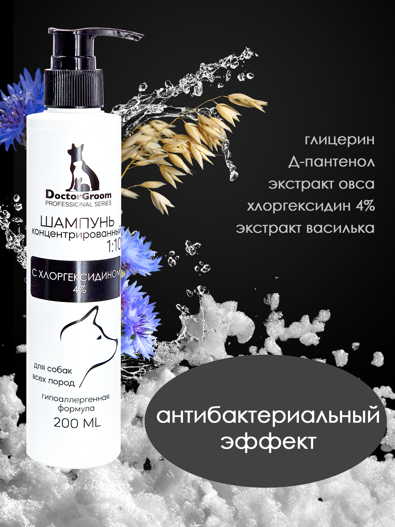 Антибактериальный, противомикробный, противогрибковый шампунь c хлоргексидином 4% для собак Doctor Groom, 200мл информация: