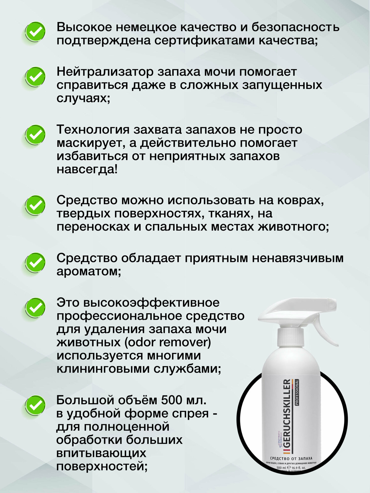 Средство от запаха мочи кошек и собак "GERUCHSKILLER" 500мл информация: