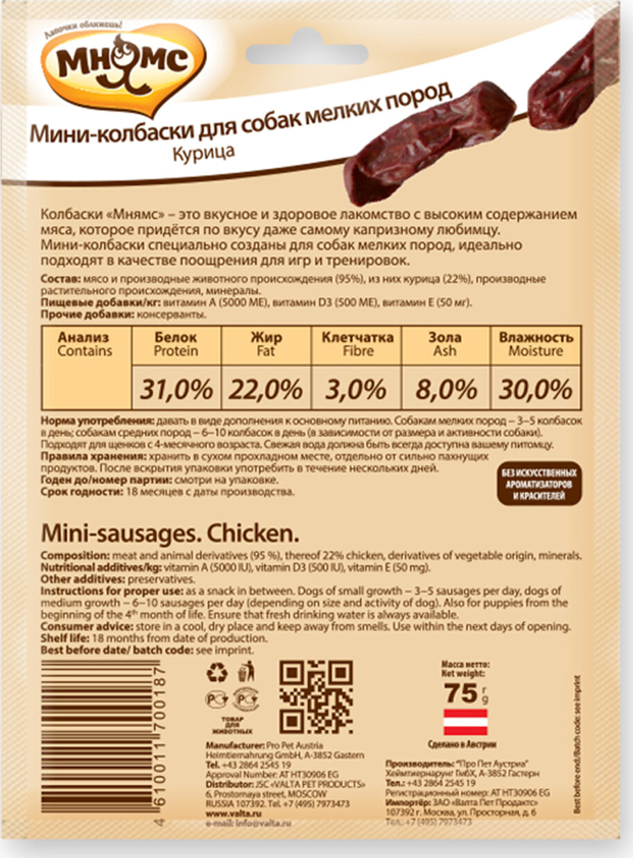 Лакомство Мнямс мини-колбаски с курицей для собак мелких пород 75 г *3 шт информация: