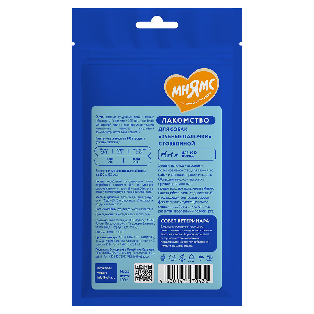 Лакомство Мнямс DENTAL для собак "Зубные палочки" с говядиной 100г информация: