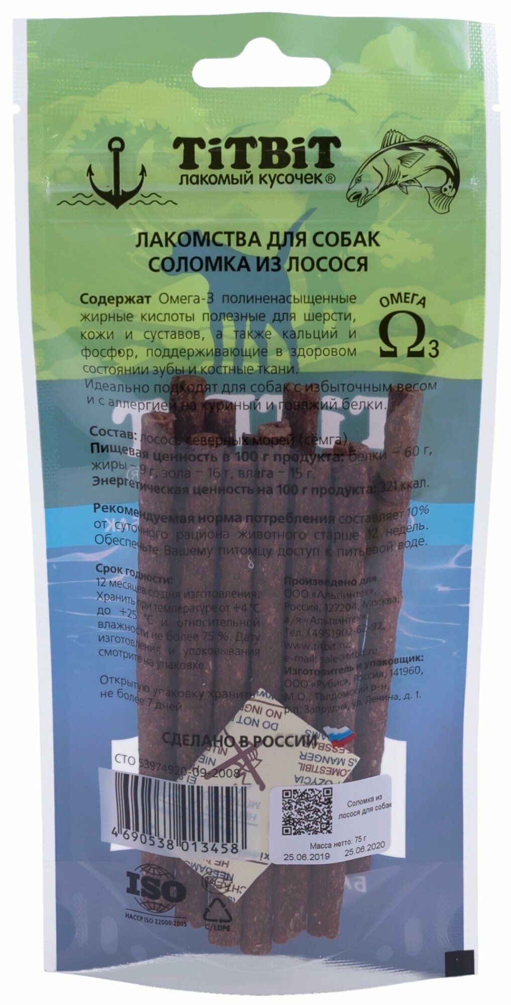Лакомство TiTBiT баренцево море соломка с лососем для собак (75 г) информация: