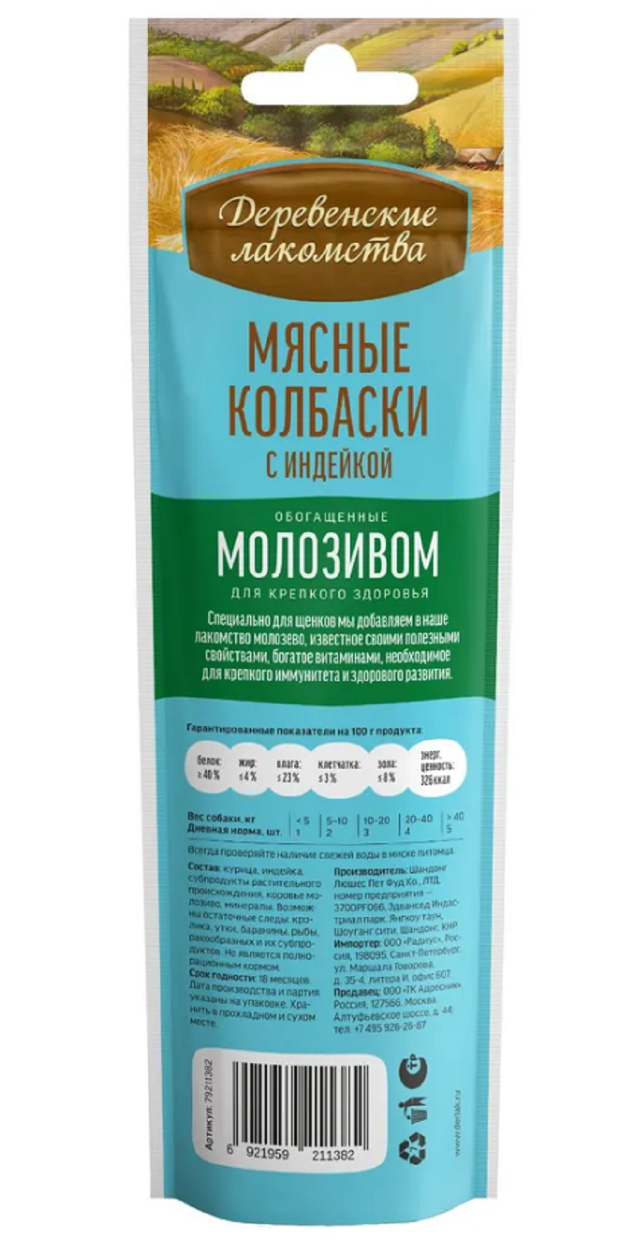Деревенские лакомства для щенков Мясные колбаски с индейкой и молозивом 45г (10 штук) информация: