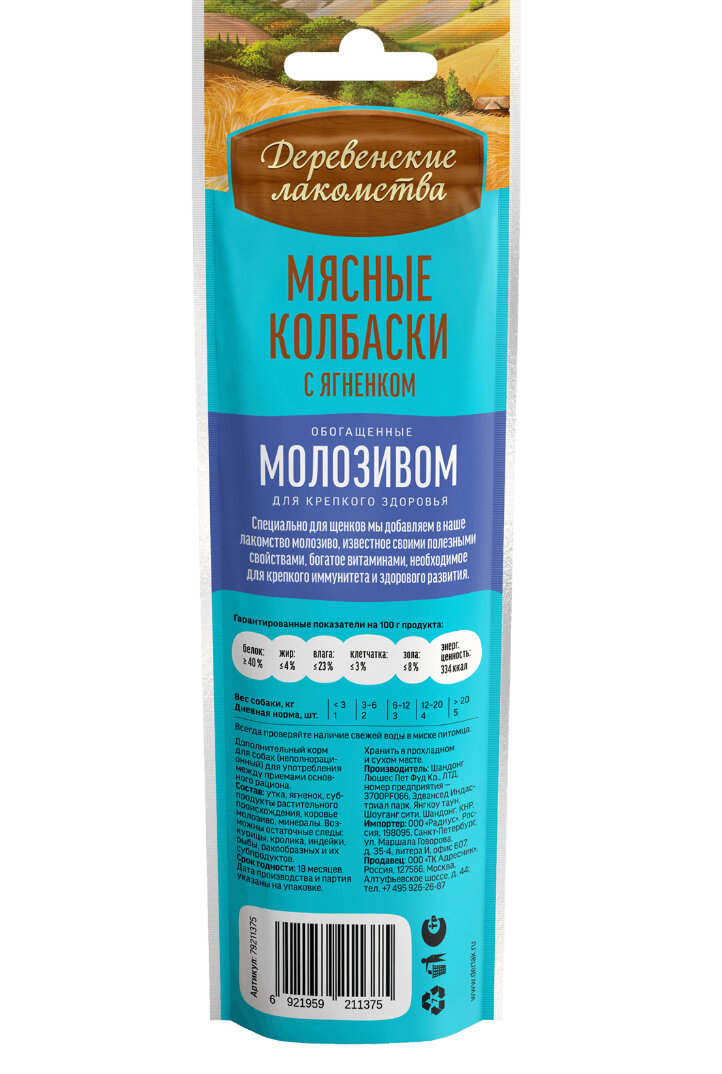 Деревенские лакомства для щенков 3 шт по 45г, колбаски с ягненком и молозивом информация:
