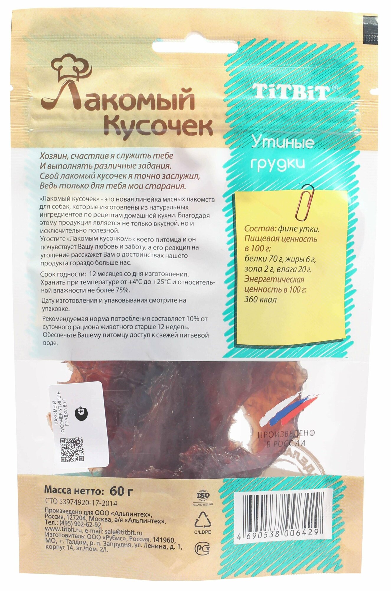 Лакомство TiTBiT Лакомый кусочек Грудки утиные для собак (60 г) информация: