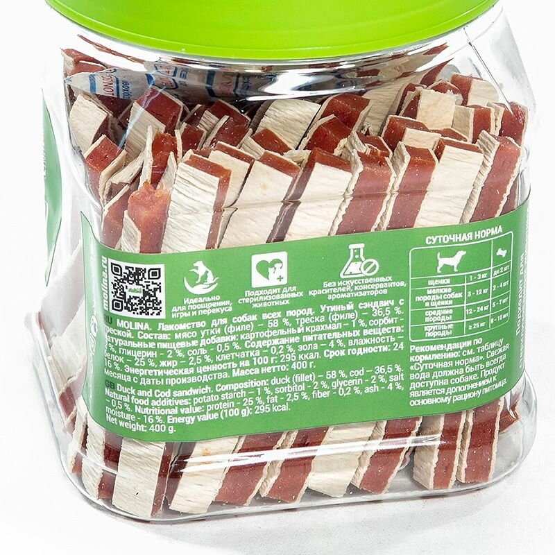 10 цен на Molina лакомство для собак "Утиный сэндвич с треской" (ведро 400 г)