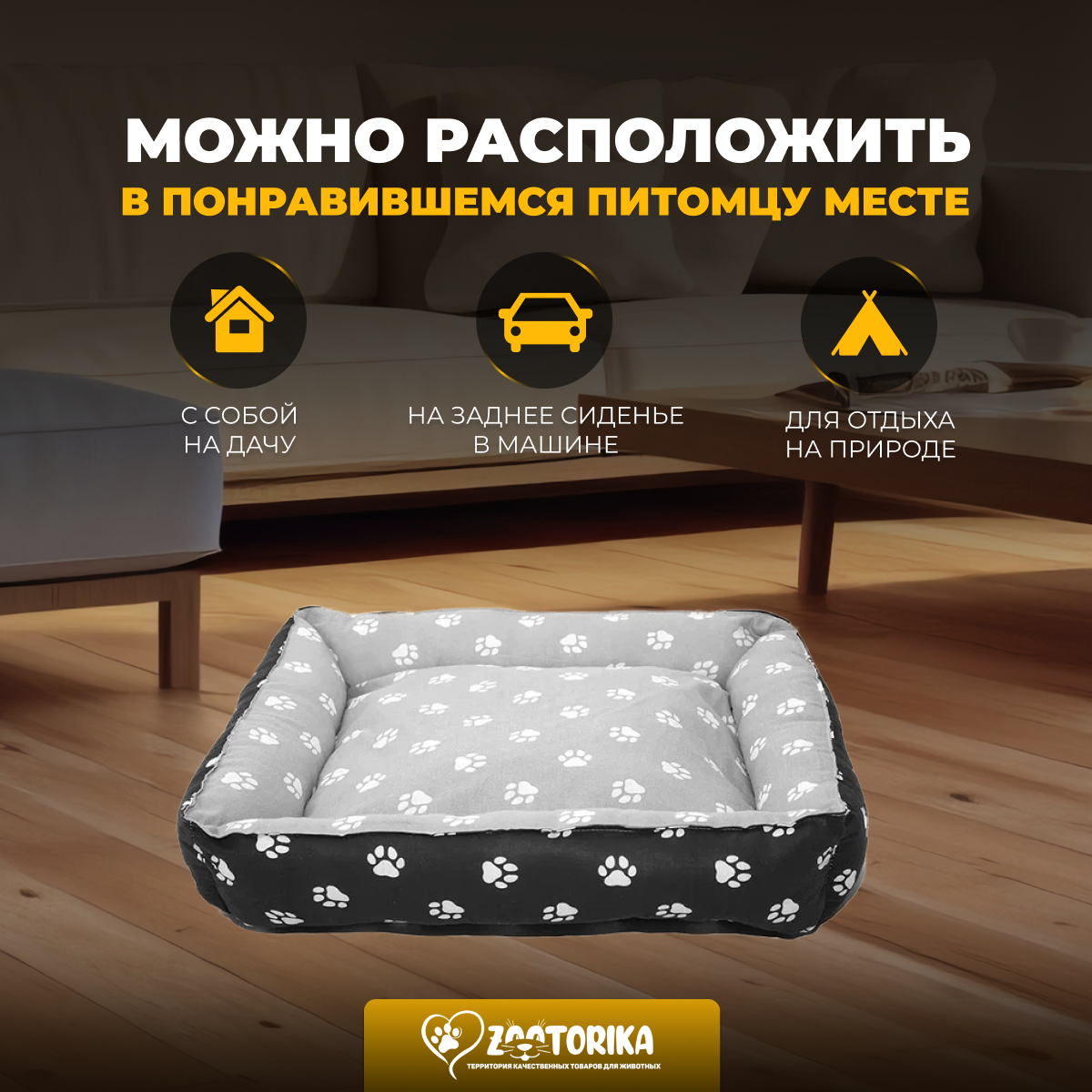 Отзывы на Лежанка для кошек и собак SunBed прямоугольная "Лапки", черная/серая, 55х45 / Лежак для животных мелких и средних пород