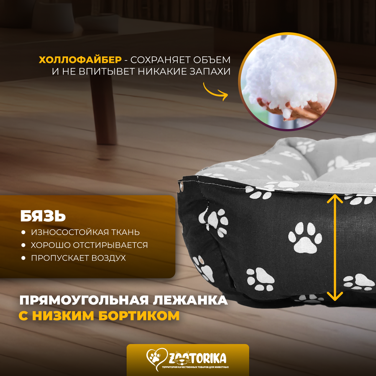 Лежанка для кошек и собак SunBed прямоугольная "Лапки", черная/серая, 55х45 / Лежак для животных мелких и средних пород информация: