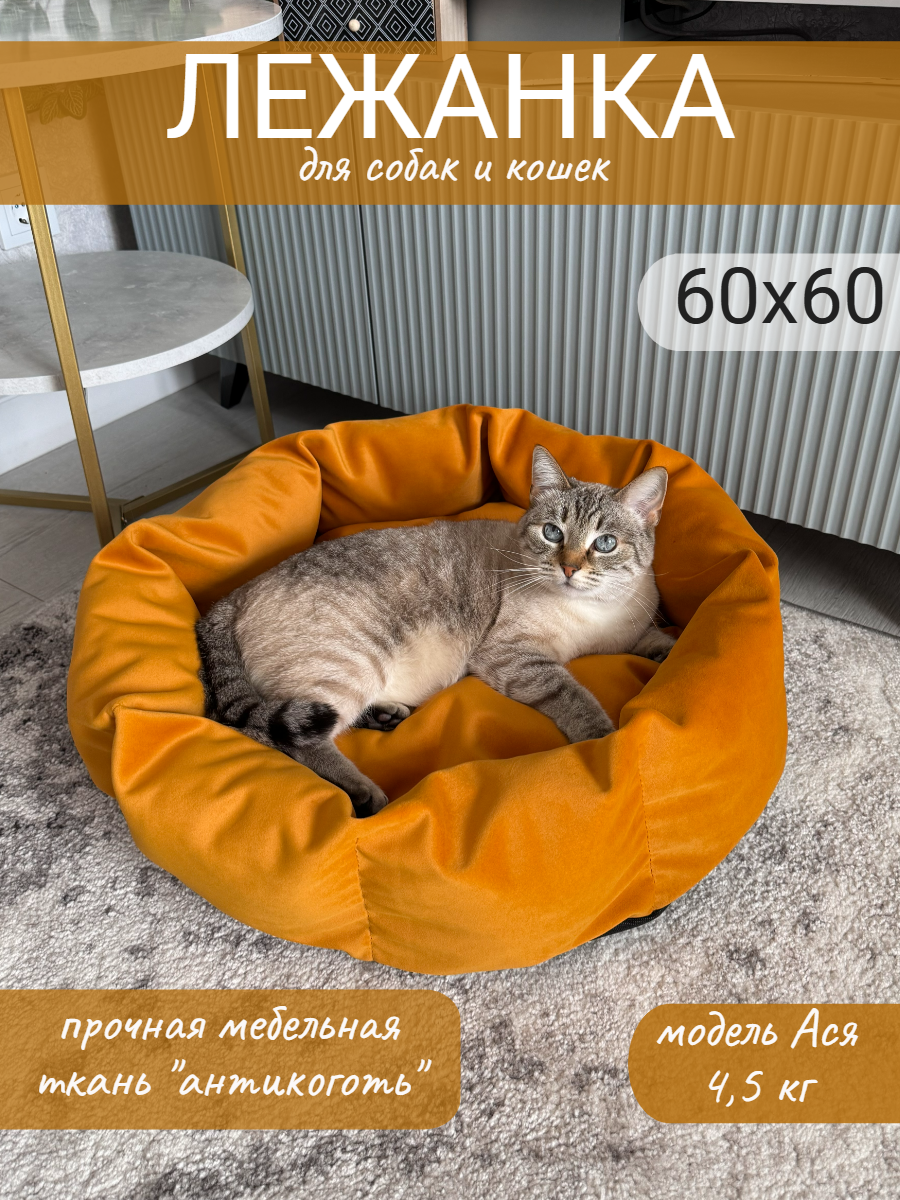 Лежанка для собак и кошек, размер 60 на 60, цвет бежевый, антивандальный велюр, мебельная ткань 1 799 ₽