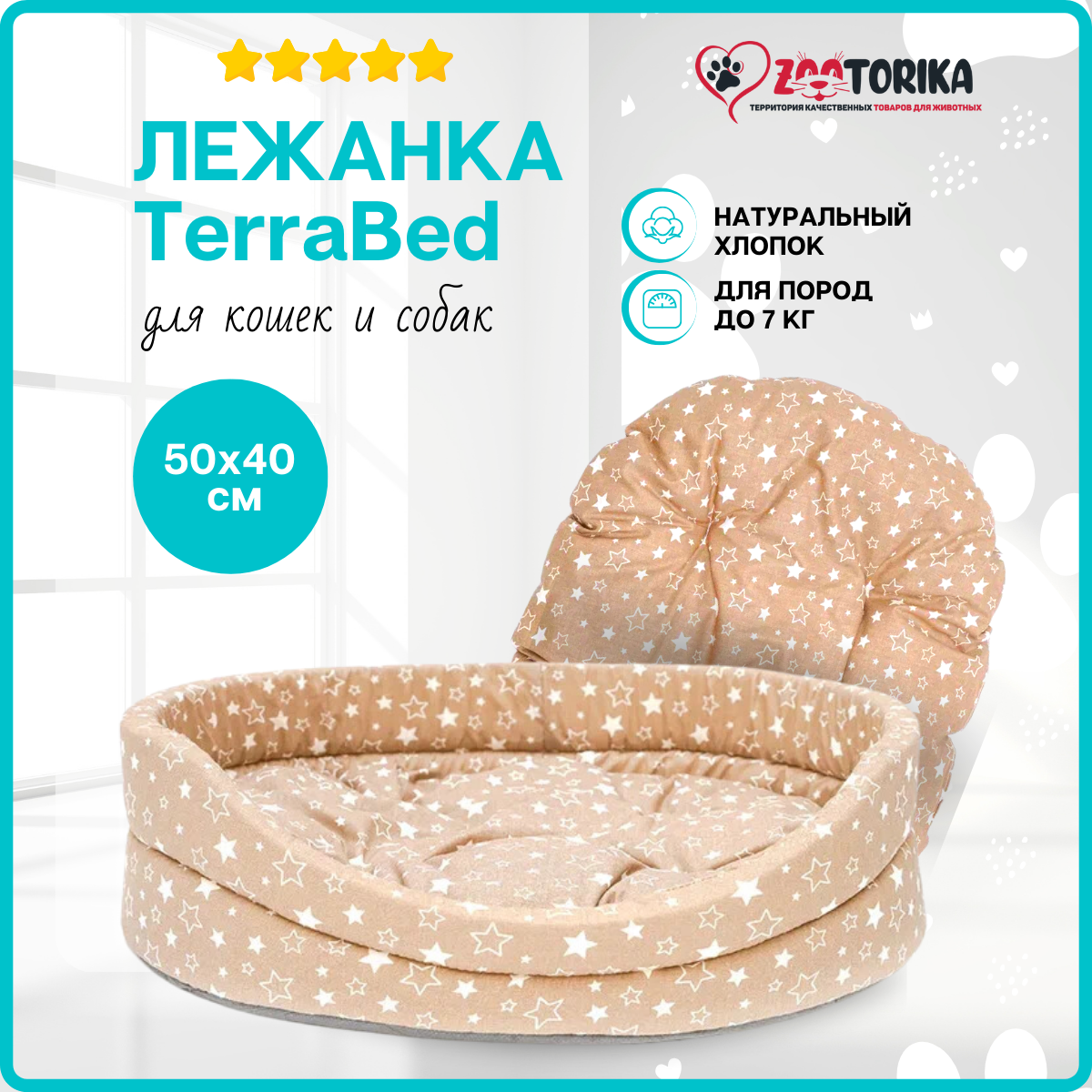 Лежанка для кошек и собак TerraBed овальная с подушкой "Звездопад", коричневая, 50х40 / Лежак для животных мелких пород информация: