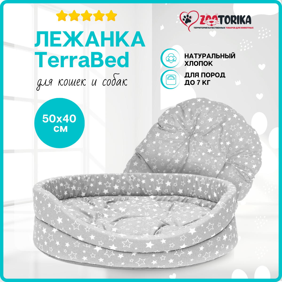 Лежанка для кошек и собак TerraBed овальная с подушкой "Звездопад", серая, 50х40 / Лежак для животных мелких пород информация:
