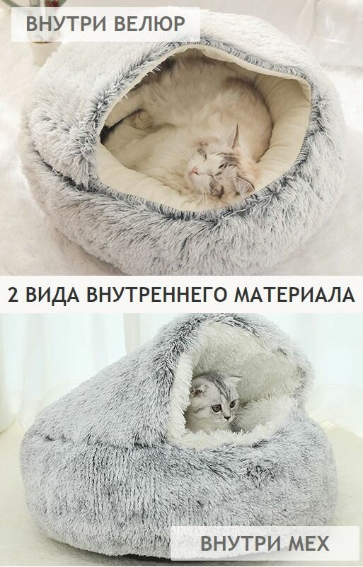 Закрытая лежанка домик для кошек M 50 см (внутри - велюр, цвет серый) / лежанка сплюшка для сфинкса информация: