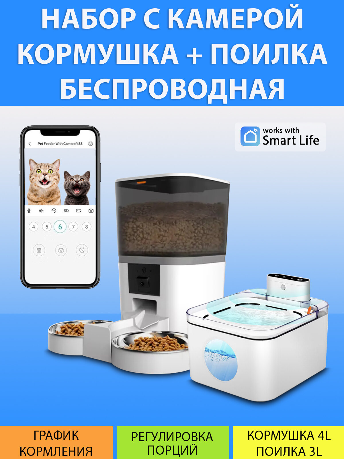 Набор для кошек и собак - автокормушка c камерой и беспроводная автопоилка, 4L+3L, до 20 дней запаса еды от MY PETS GADGETS 11 290 ₽