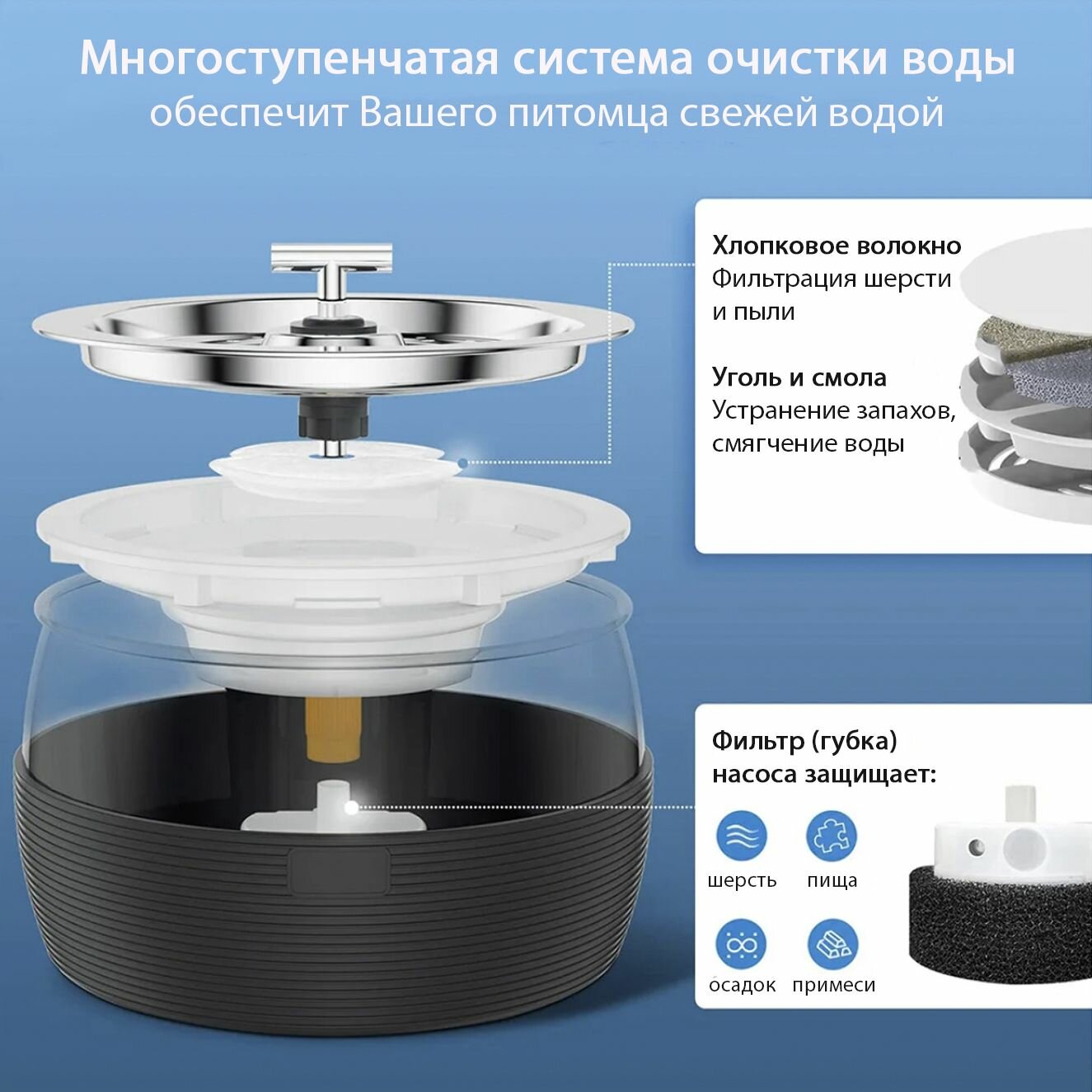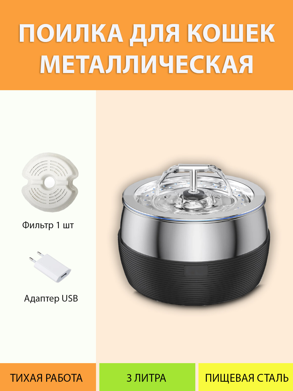 Поилка металлическая 3 литра для кошек. Поилка фонтан из нержавеющей стали и ПВХ (Черный цвет) MY PET`S GADGETS информация: