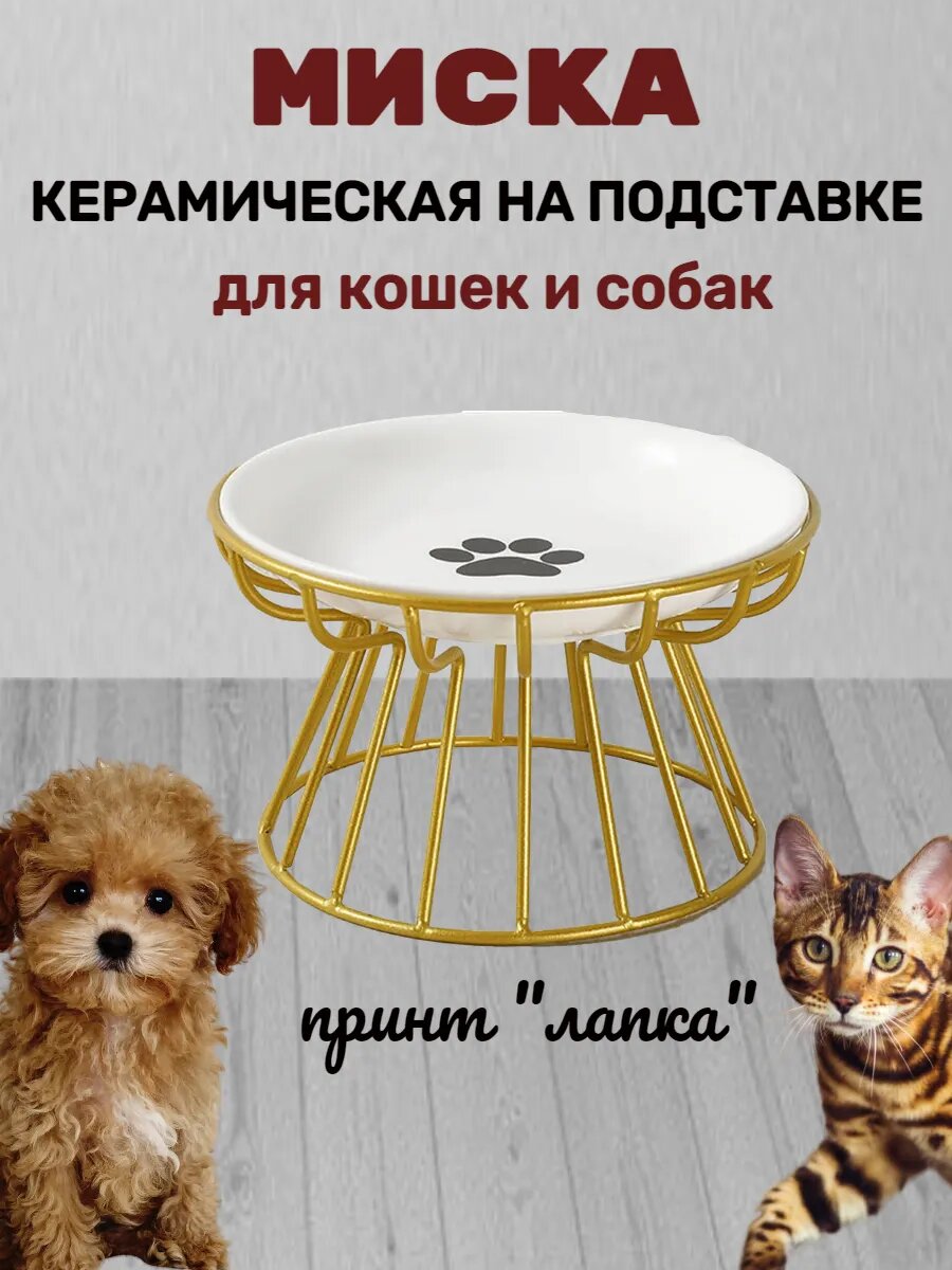 10 цен на Миска для животных, керамика/металл, на подставке, золотая, рисунок "лапка"