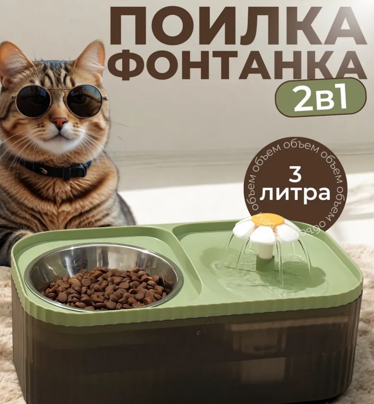 Поилка фонтан автоматический с миской для животных, автопоилка, зеленая информация: