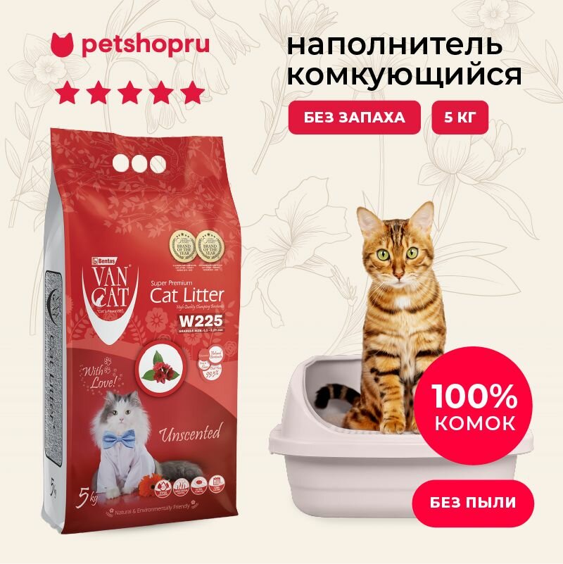 Van Cat комкующийся наполнитель 100% Натуральный, без пыли, бентонит, 5 кг информация: