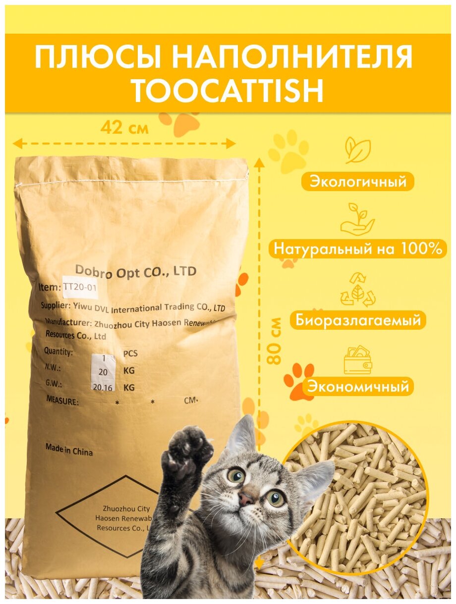 Отзывы на Наполнитель для кошачьего туалета, TOOCATTISH, Оригинал, 20 кг, 48 л, тофу, комкующийся, соевый, смываемый
