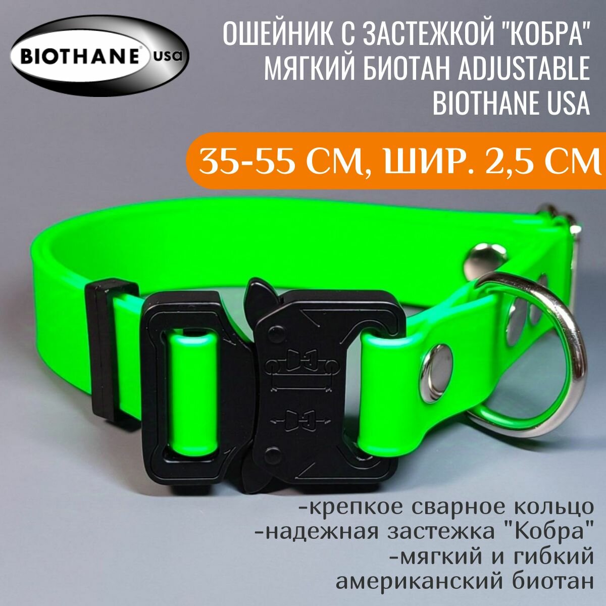 Отзывы на R-Dog Ошейник из мягкого биотана (Biothane USA), металлическая пряжка "Кобра", цвет салатовый неон, длина 35-55 см, ширина 2,5 см
