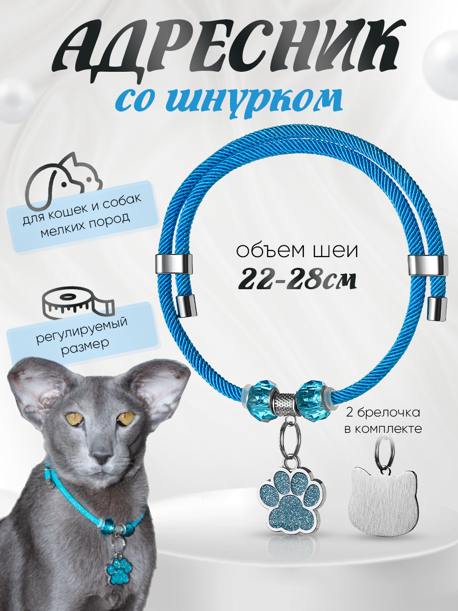 Ошейник Балуем Котика, шнурок, с адресником, синий, 22-28 см 550 ₽