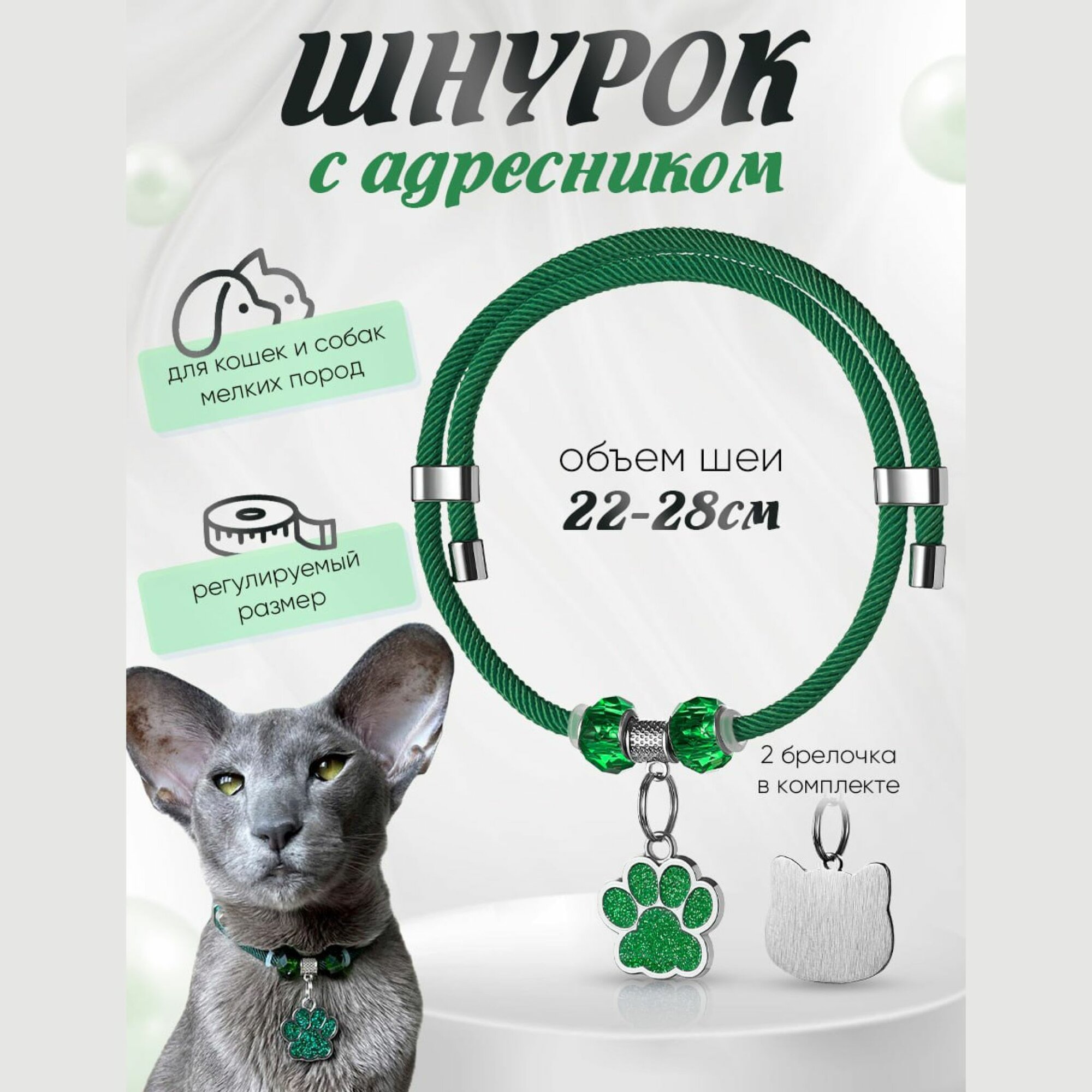 Ошейник с адресником для кошек и собак мелких пород "Балуем котика", зеленый. информация: