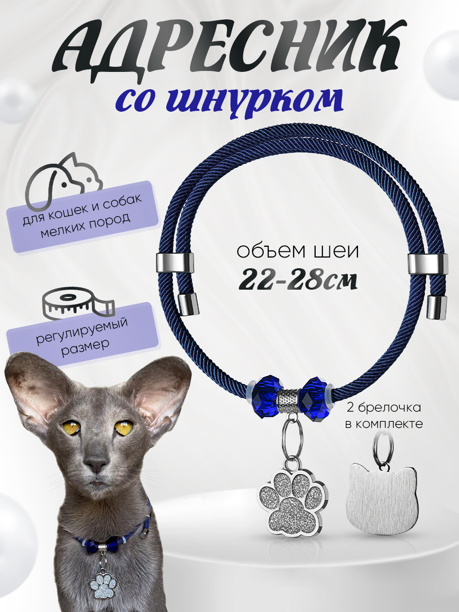 Ошейник Балуем Котика, шнурок, с адресником, синий, 22-28 см 550 ₽