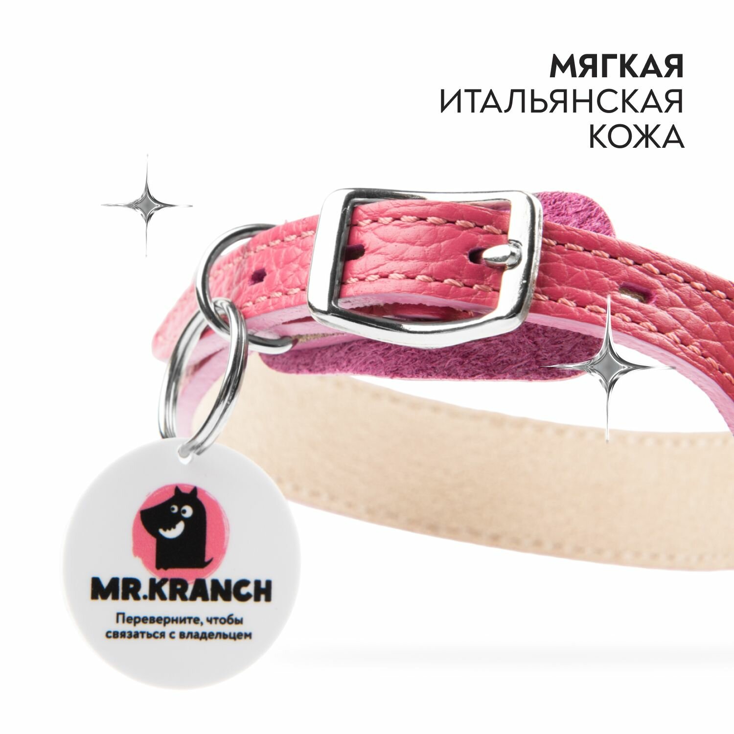 Ошейник Mr.Kranch для собак из натуральной кожи с QR-адресником, 30-35см, розовый VLT-MKR174546 3 933 ₽
