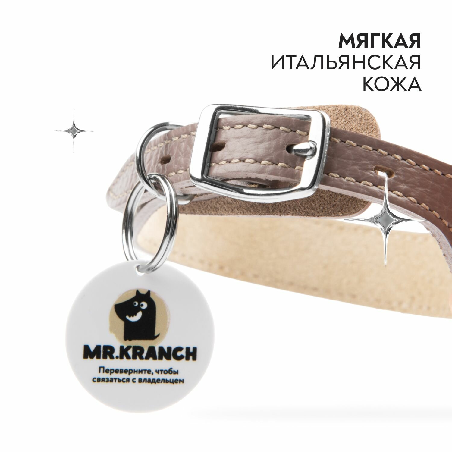 Ошейник Mr.Kranch для собак из натуральной кожи с QR-адресником, 20-24см, бежевый VLT-MKR174690 3 134 ₽