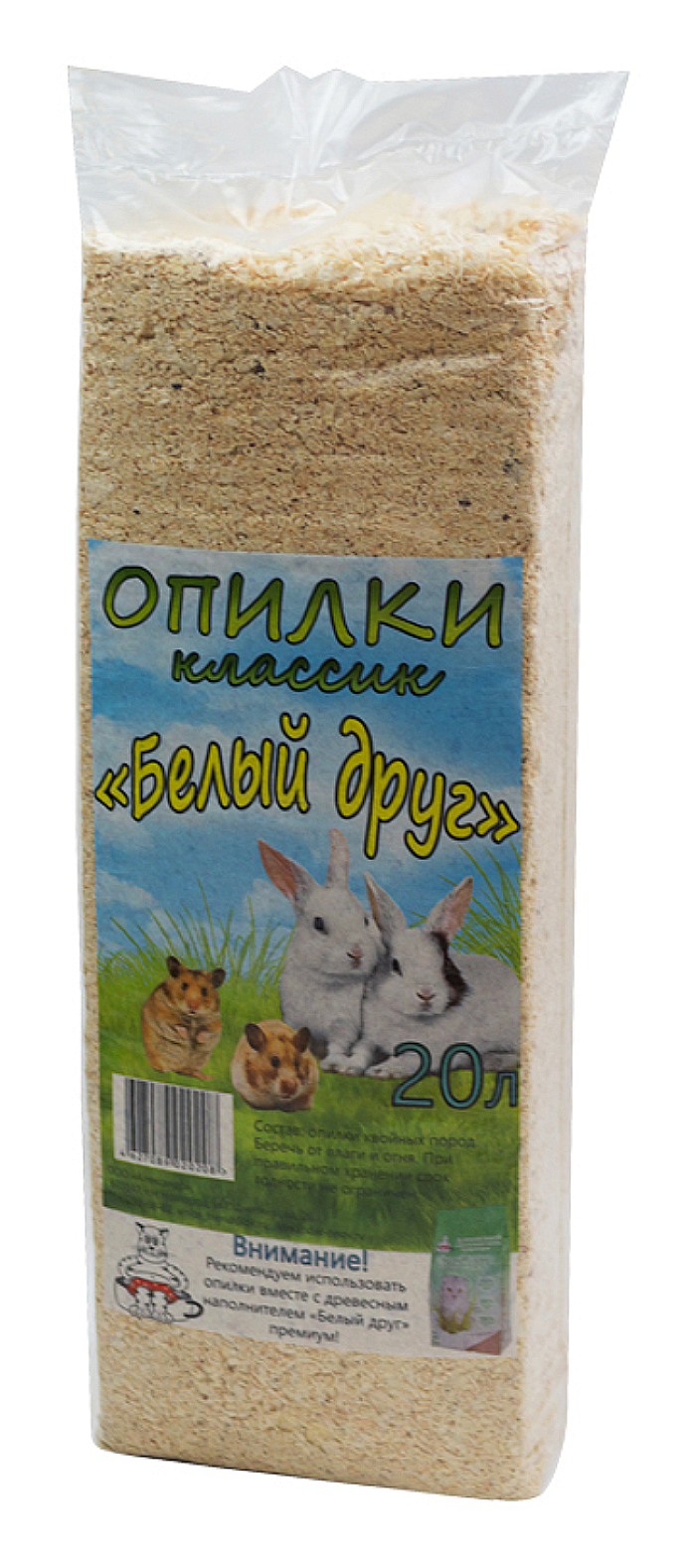 Наполнитель для грызунов Белый Друг опилки из хвойных пород, впитывающие, без отдушки для хомяков, морских свинок, кроликов и дегу 20л информация: