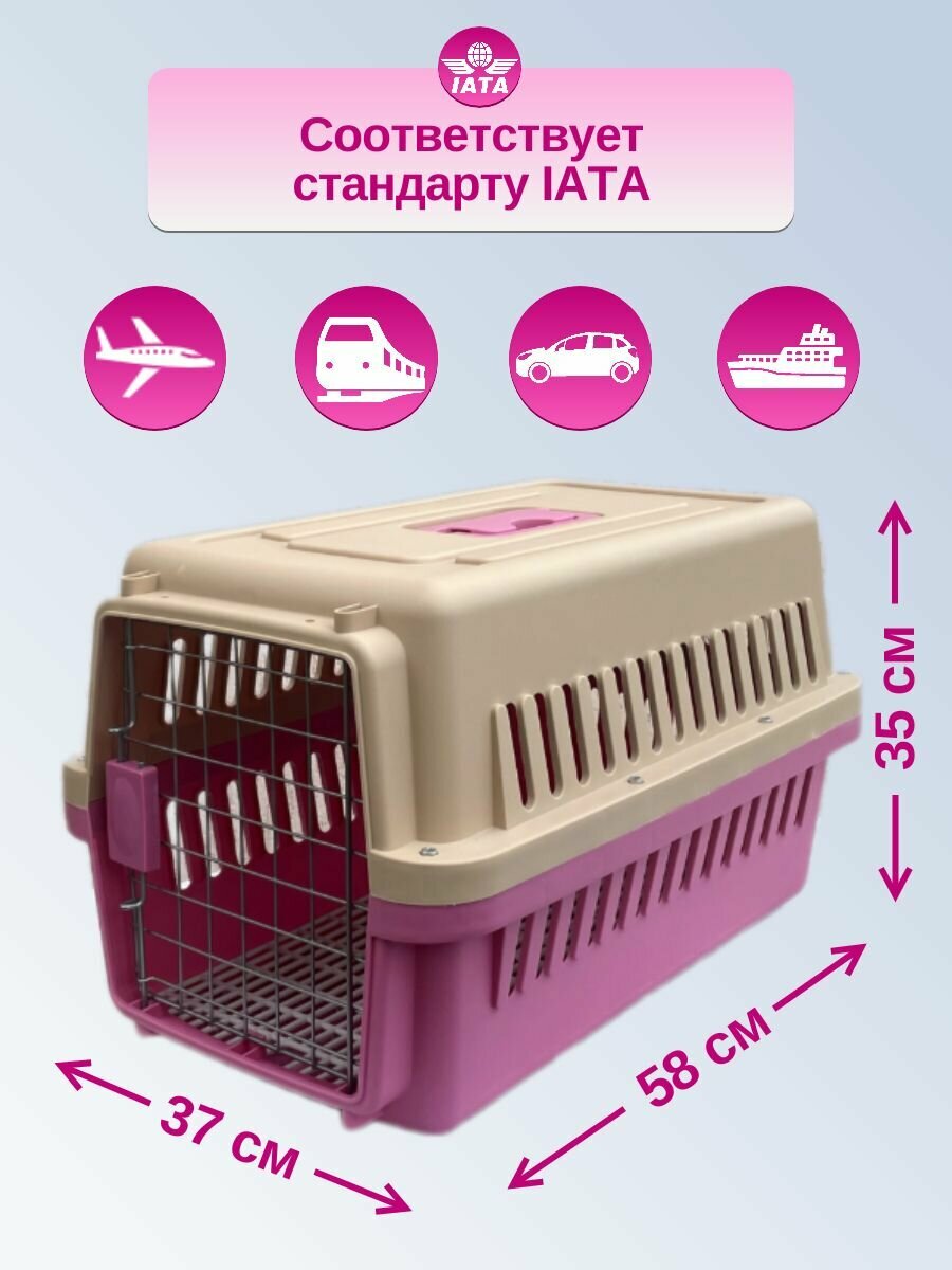 Переноска для кошек и собак средних пород, пластиковая с металлической дверцей и замком, 58х37х35 см, до 12 кг, розовая информация: