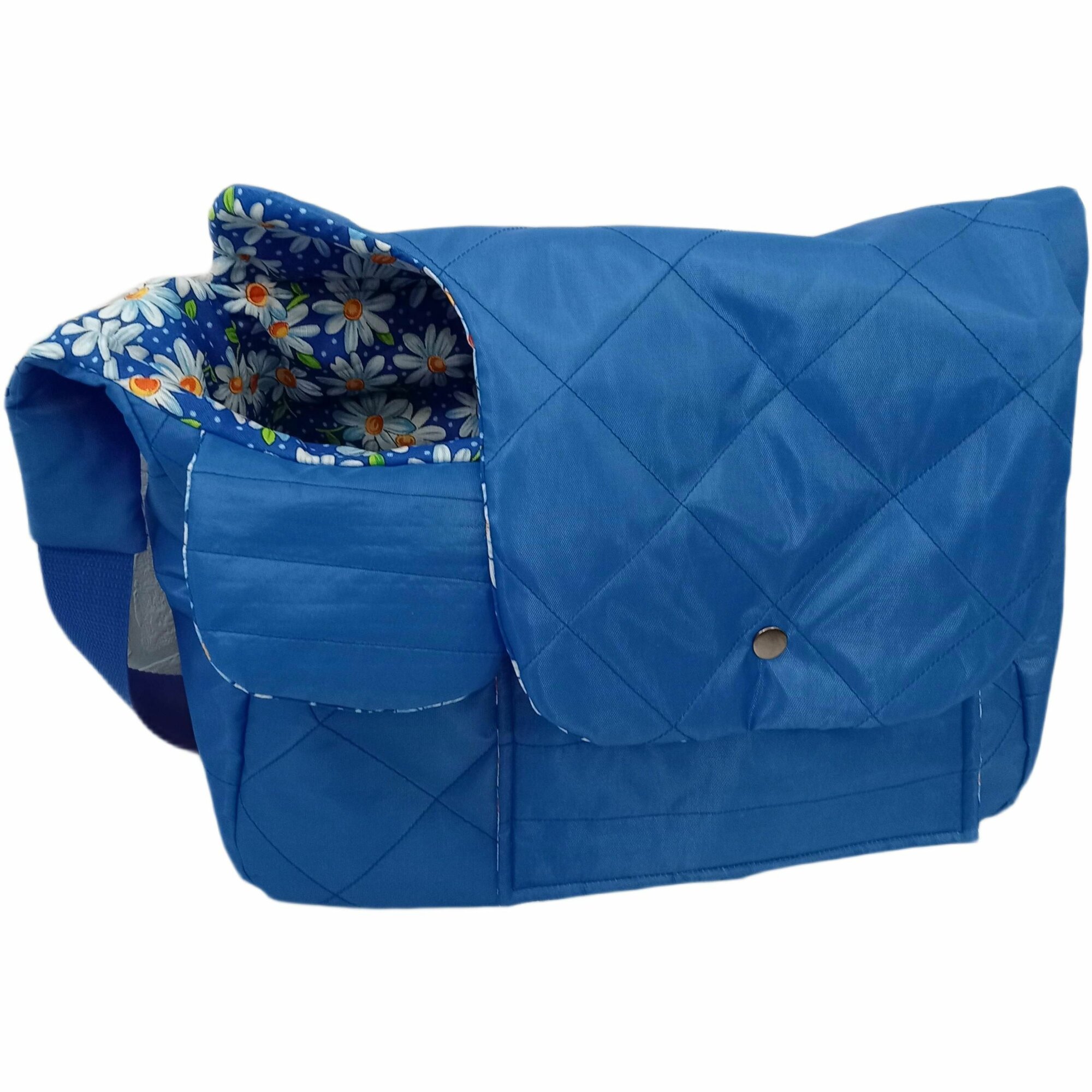Летняя Сумка-переноска для собак весом 3-4 кг, размер М 36см Х 14см Х 20/25 см, синяя ромашка. На левое бедро информация: