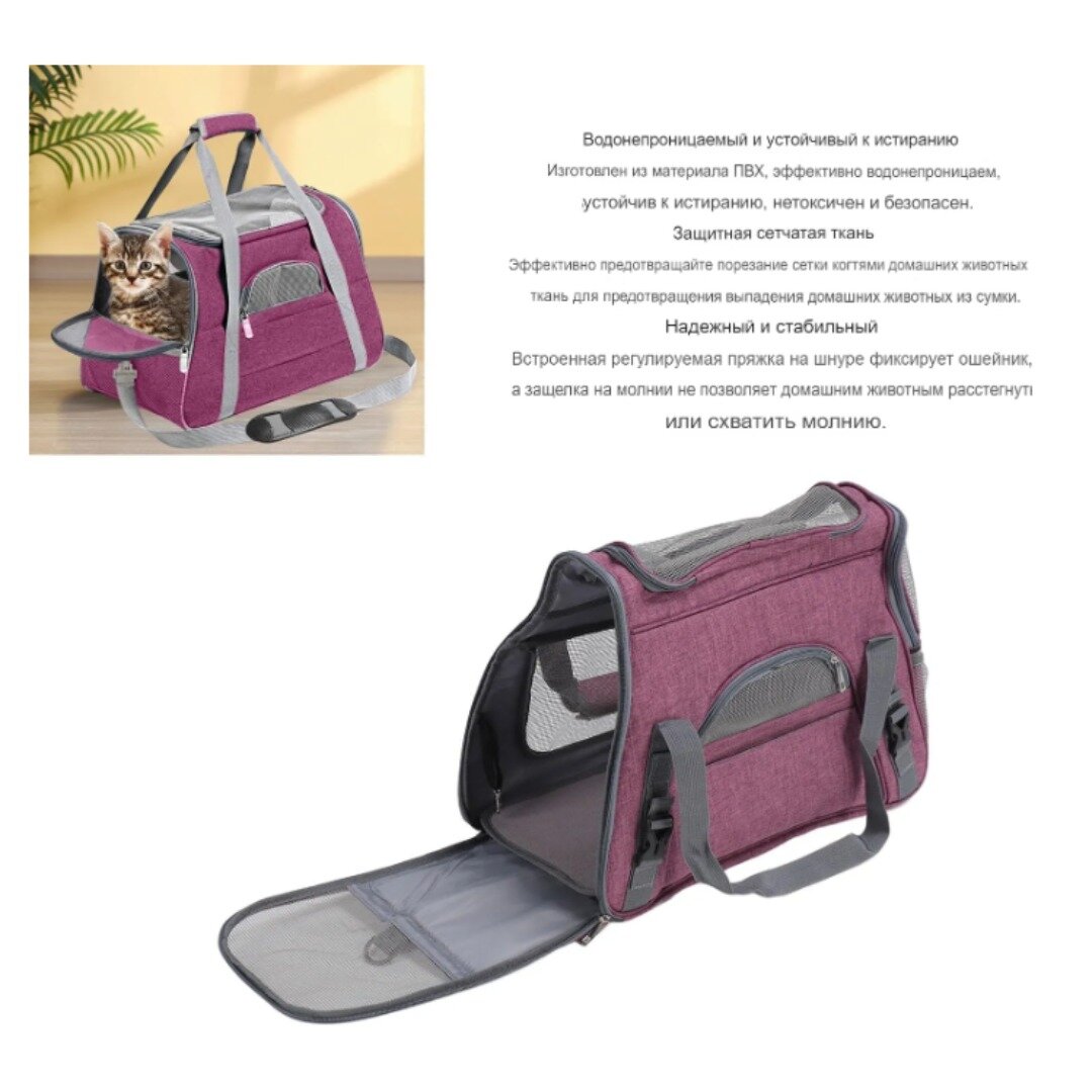 Сумка переноска для животных 45х23х35 см / Переноска для кошек и собак мелких пород с подстилкой-матрасиком и окошками из сетки / фиолетовый 2 490 ₽
