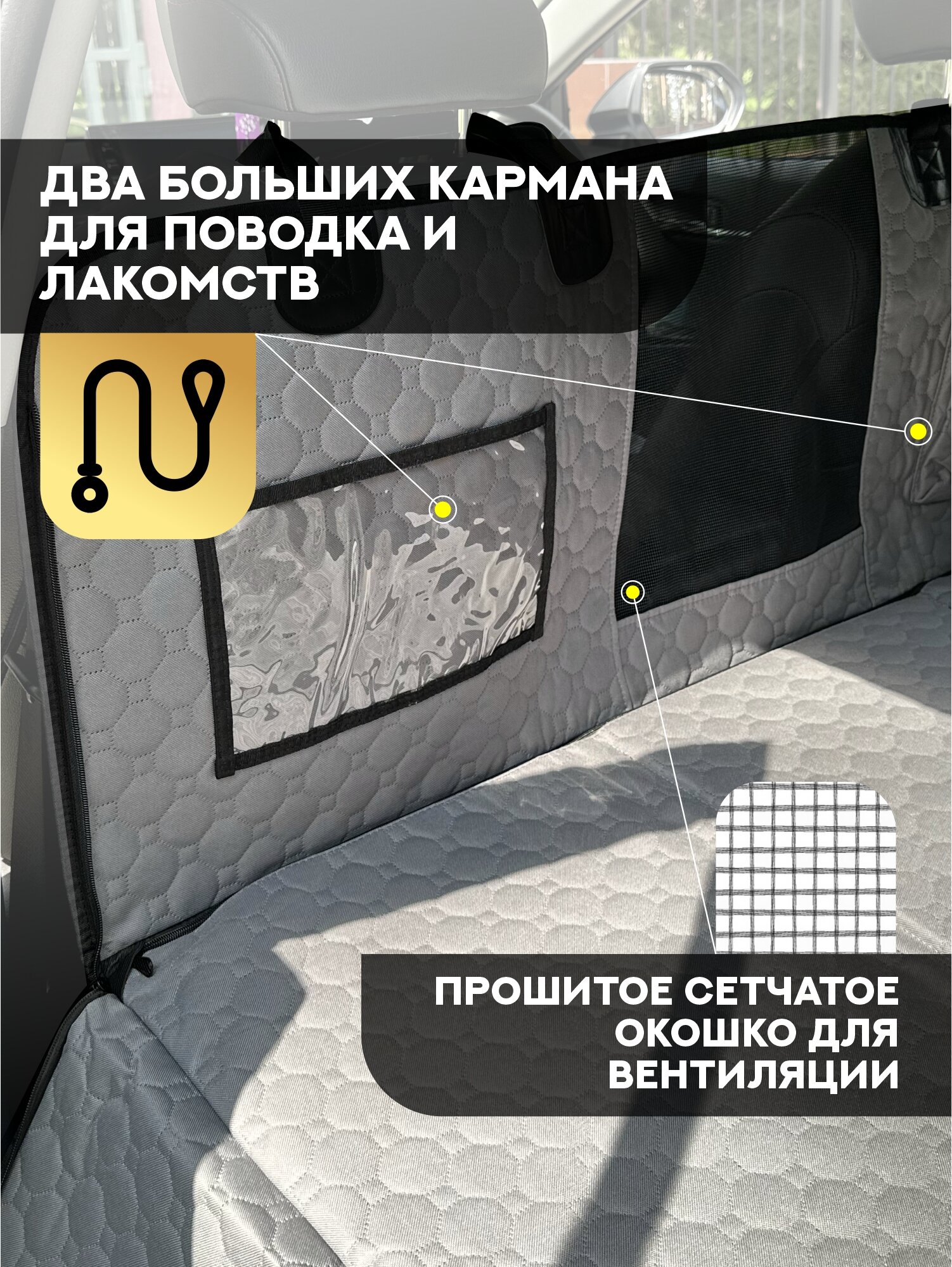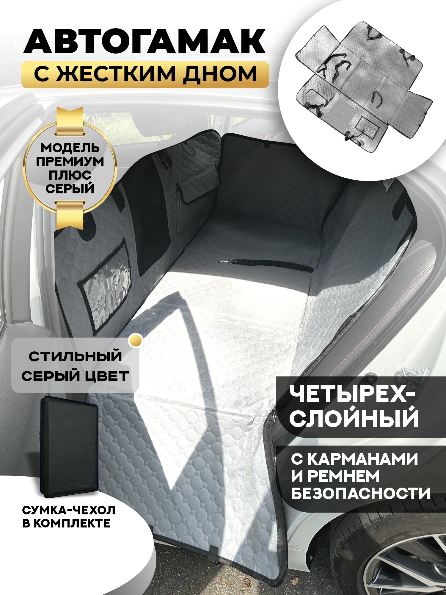 Автогамак для перевозки собак "Хвостатый пассажир", модель Премиум Плюс с жестким дном и ремнем безопасности, серый информация: