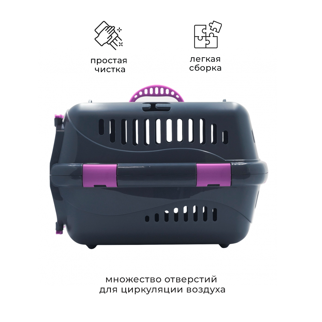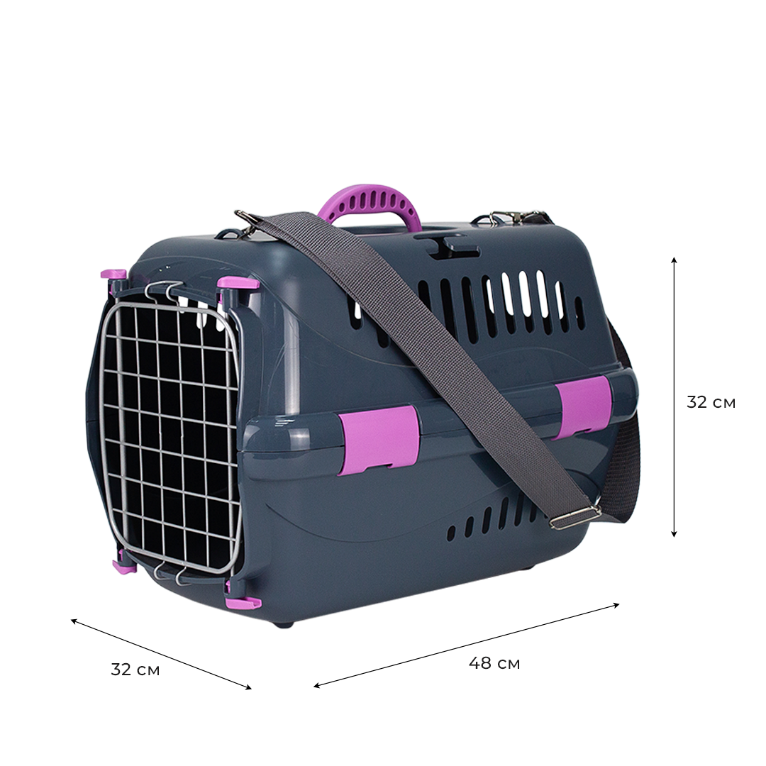 Пластиковая переноска для кошек и собак ZOOSET, 48х32х32 см, металлическая дверца и плечевой ремень, серый/сиреневый информация:
