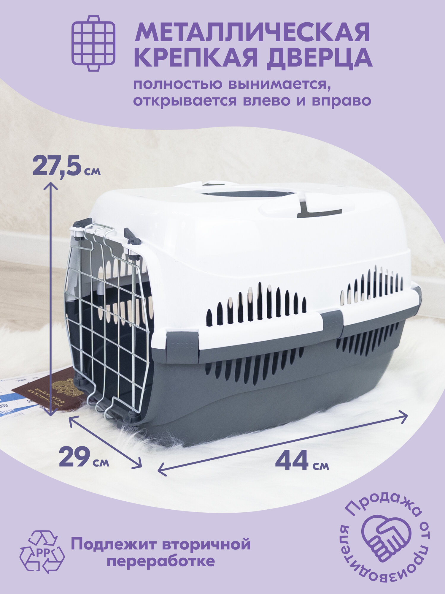 Отзывы на Переноска 44 х 29 х 27,5см пластиковая PetTails с металлической дверцей (до 9кг) (сер. низ/бел. верх)