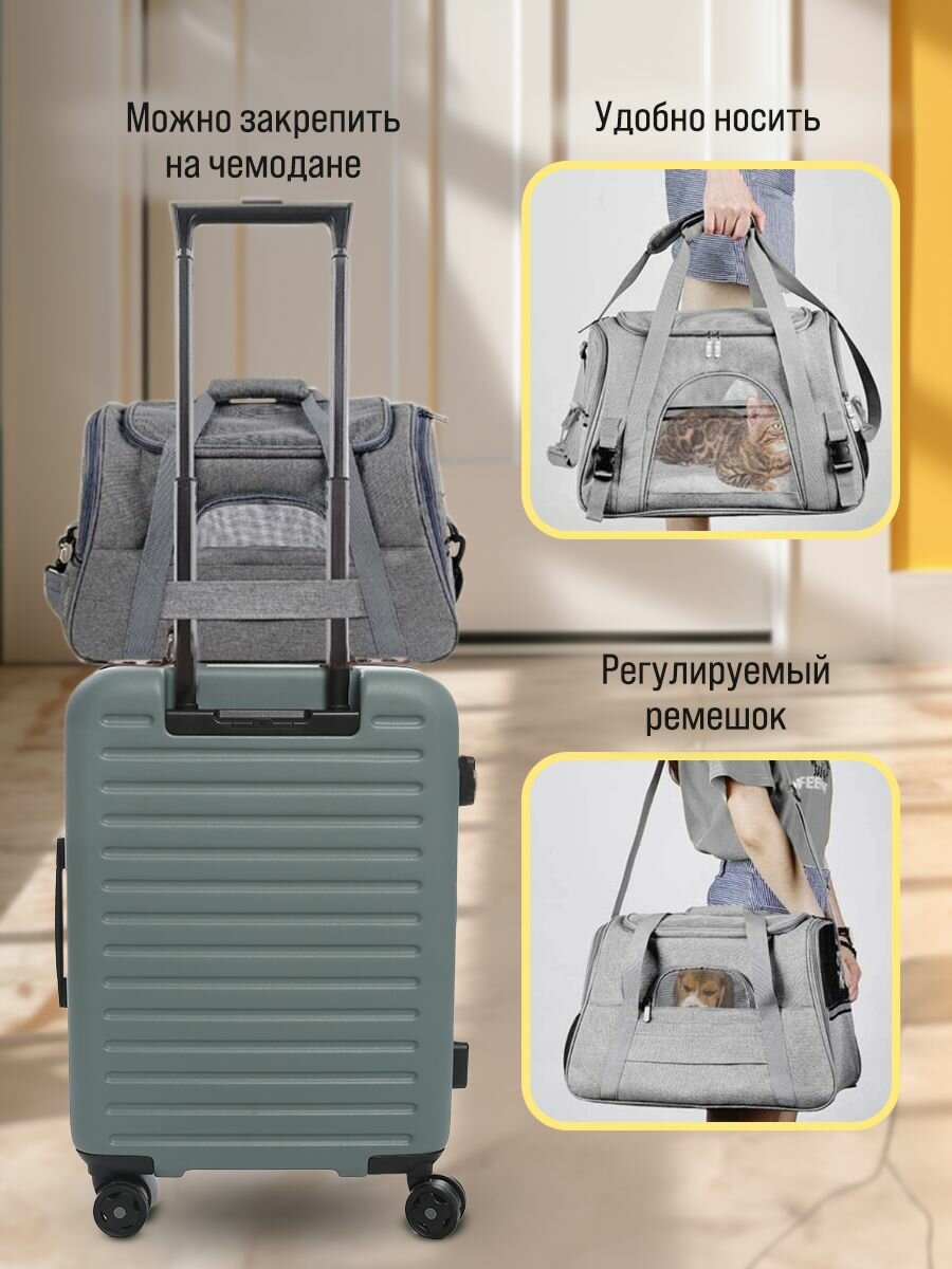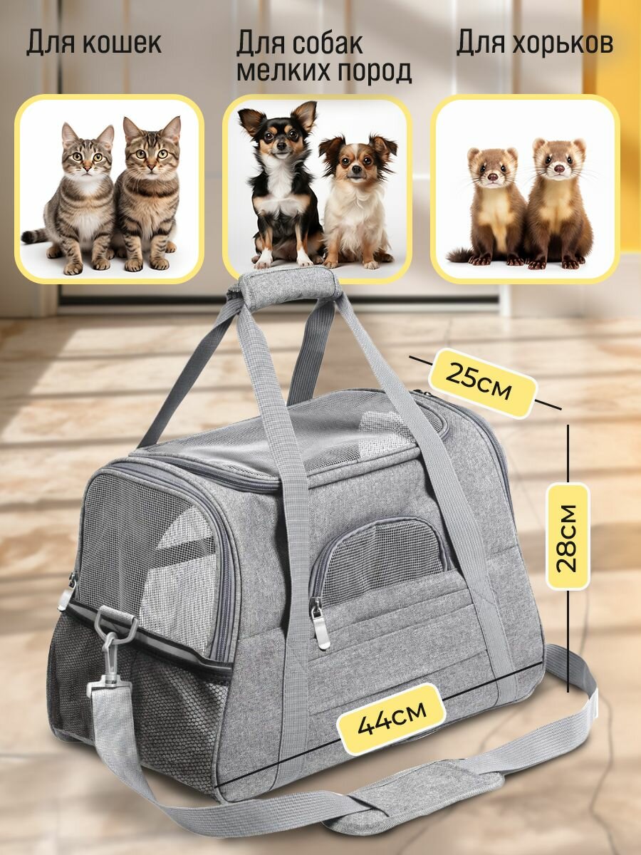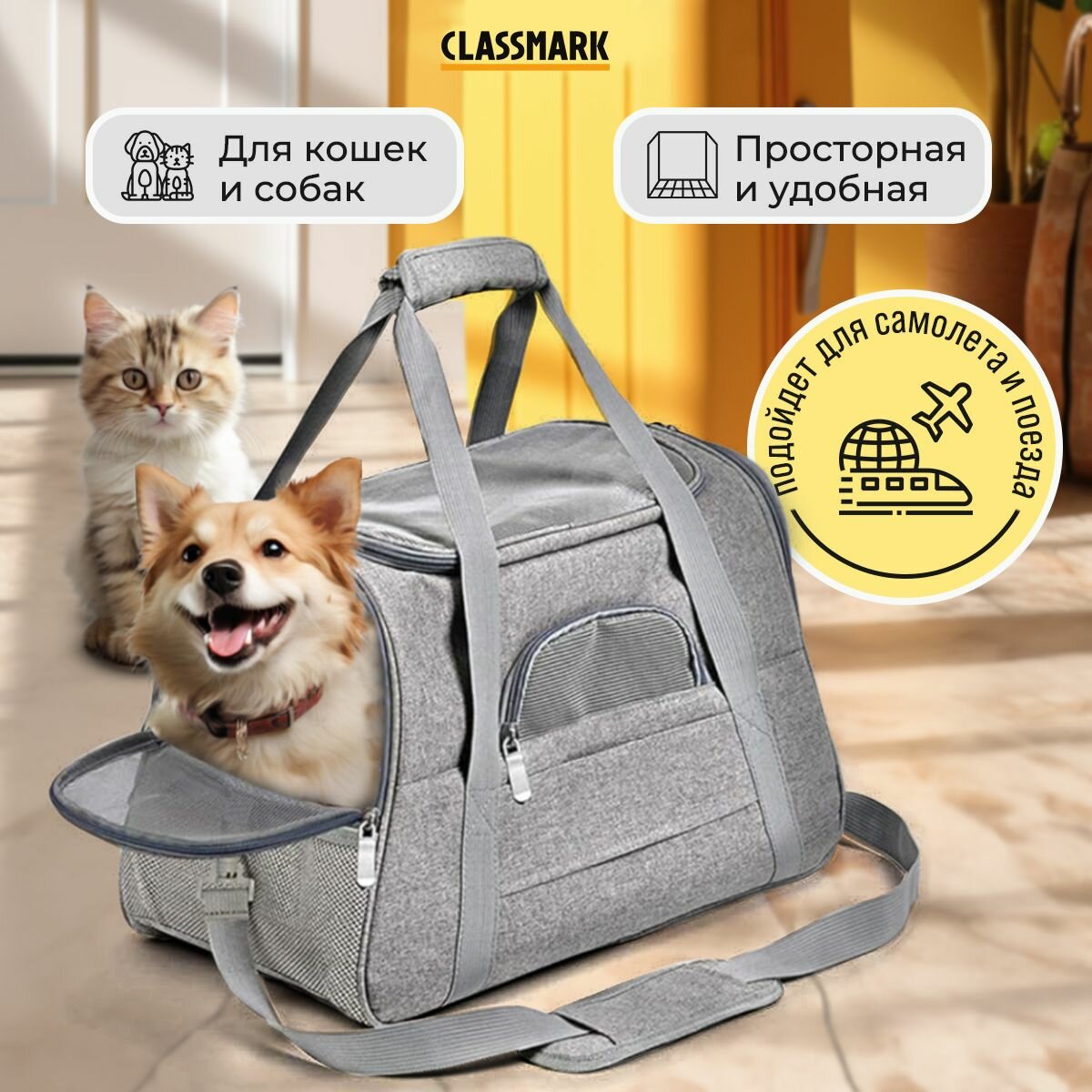 Сумка переноска для кошек, для собак мелких и средних пород, 43х25х28 см, Серый