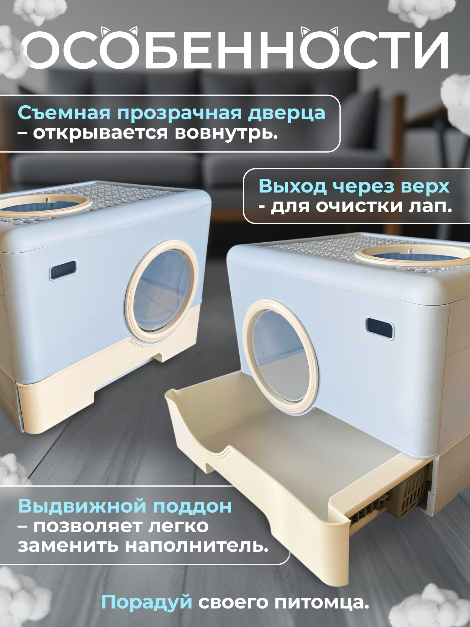 Отзывы на Закрытый лоток (туалет) для кошек, 52х41х38.5 см, выдвижной поддон, люк-выход, совок, прозрачные съемные двери, синий