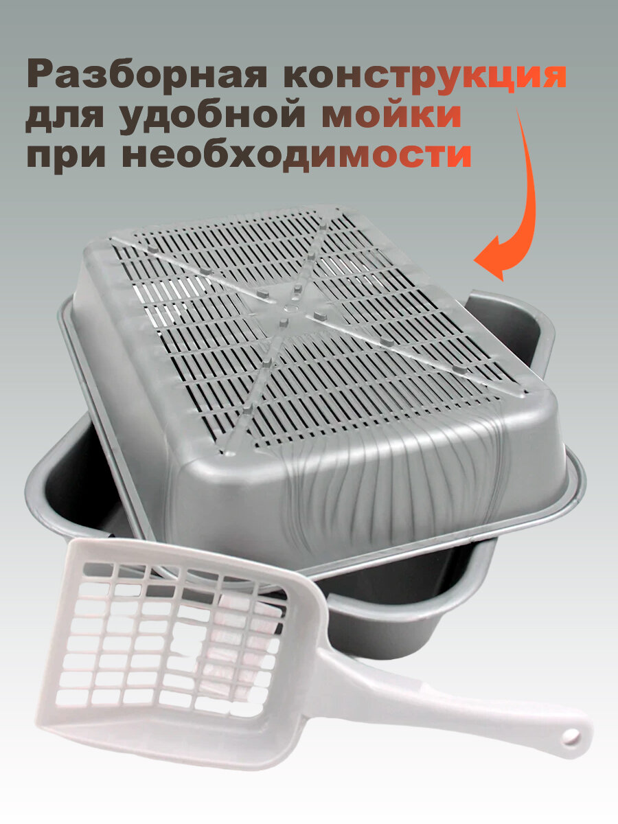 Кошачий лоток с сеткой и совком 36х26х6 см №1 для кошек и котят, серебристый перламутр информация: