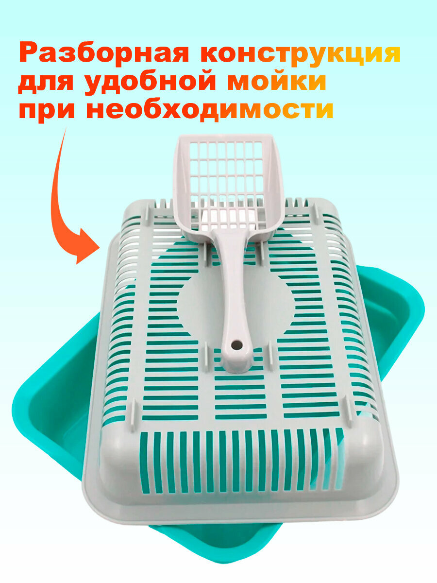 Лоток для кошек с сеткой и лопаткой 34,5х25,5х7,5 см открытый №3, бирюзовый-серый информация: